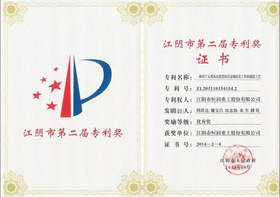 2015年公司发明专利“一种用于大型风电装置的合金钢及其工件的制造工艺”获得江阴市第二届专利奖