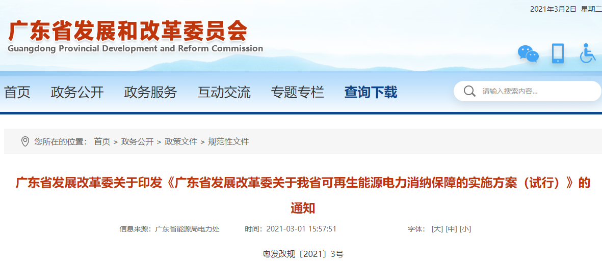 3月1日,广东省发改委官网印发《广东省发展改革委关于我省可再生能源电力消纳保障的实施方案(试行)》的通知,通知指出:保障电力系统安全稳定运行和连续可靠供应,确保可再生能源机组优先发电,努力实现弃水电量显著减少,风电、光伏等新能源全额消纳。